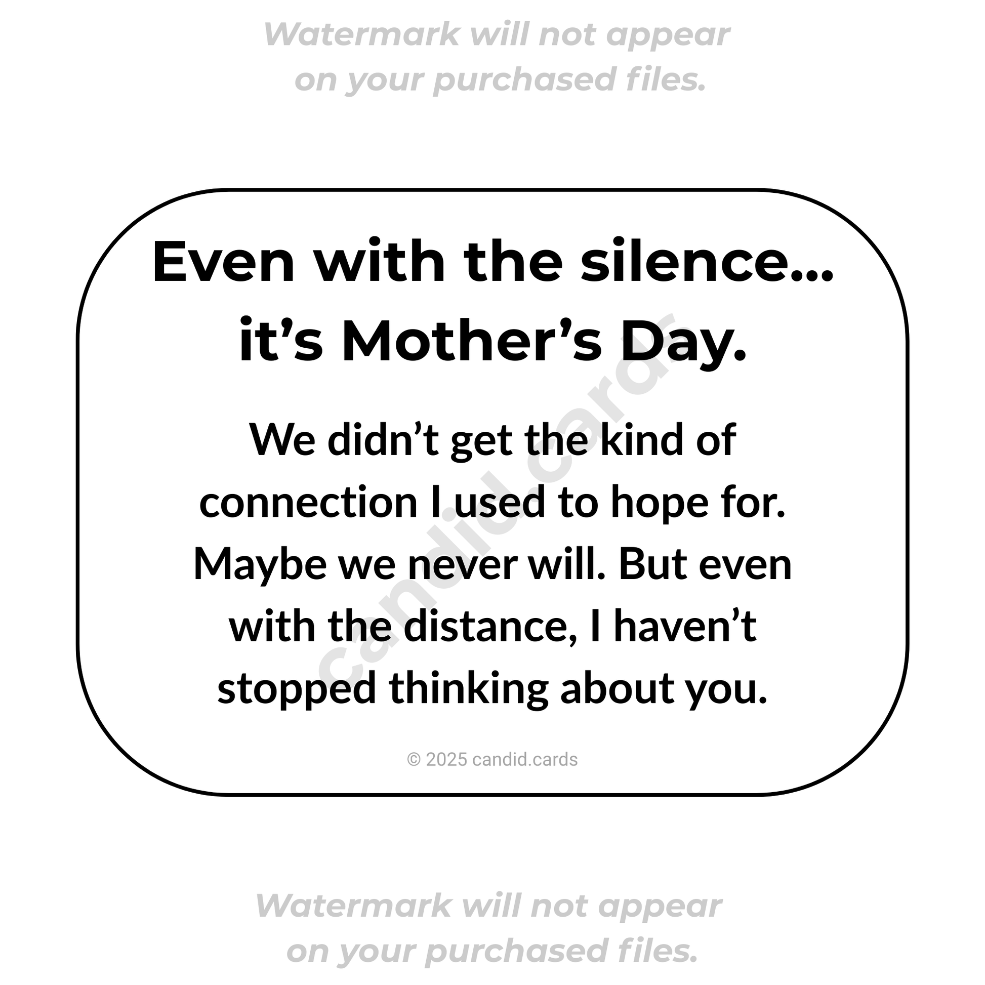 This card is for the mother you still think about, even if the relationship never became what you wanted it to be. There’s no gloss, no reunion fantasy—just a quiet, real acknowledgment that care can exist even from far away.